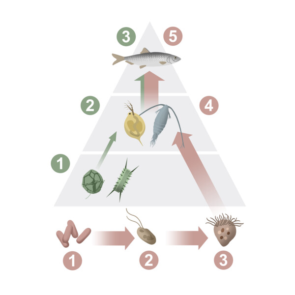 At the bottom of the food web we find phytoplankton and bacteria, basal producers. The balance between these two actors can be decisive for how efficient the food web will be, i.e. how much energy from the basal production reaches top consumers. Zooplankton feeds on phytoplankton, while bacteria are too small to be directly consumed by zooplankton. Instead, they are eaten by protozoa, which are then consumed by zooplankton. Thus, another step has been added to the food web, and it grows more complicated.