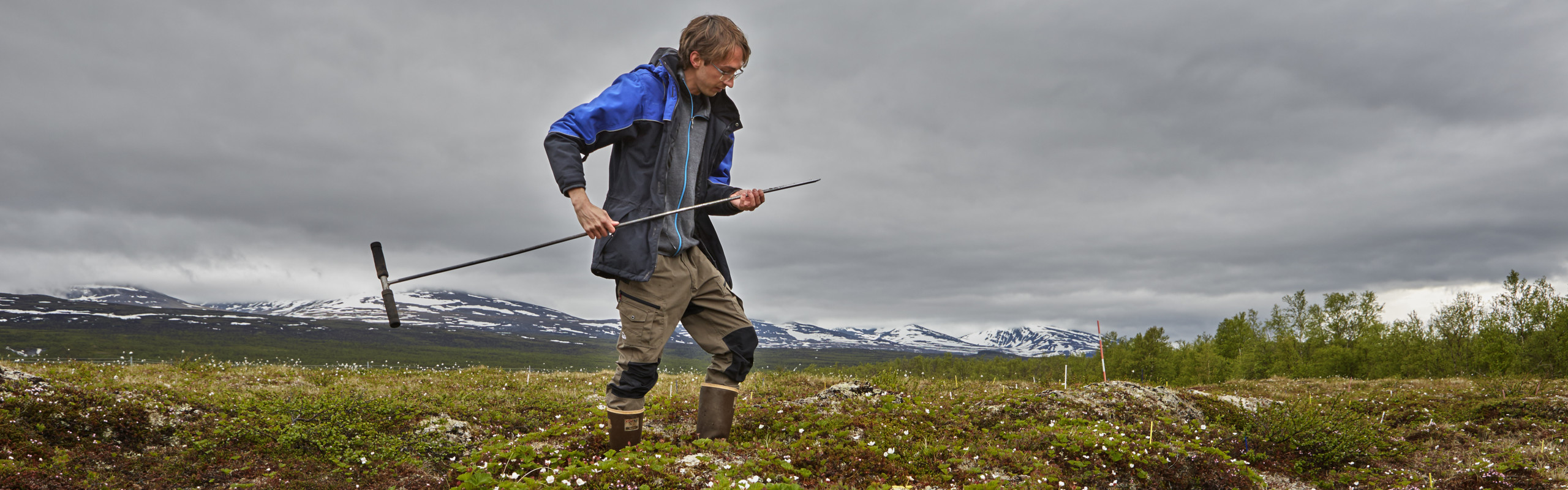 Sylvain Monteux, doctoral student at the Department of Ecology and Environmental Science and Climate Impacts Research Centre. He is stationed at Abisko Scientific Research Station (ANS). Here, at Storflaket , a field outside of Abisko often used for studies by researchers at Abisko Scientific Research Centre.