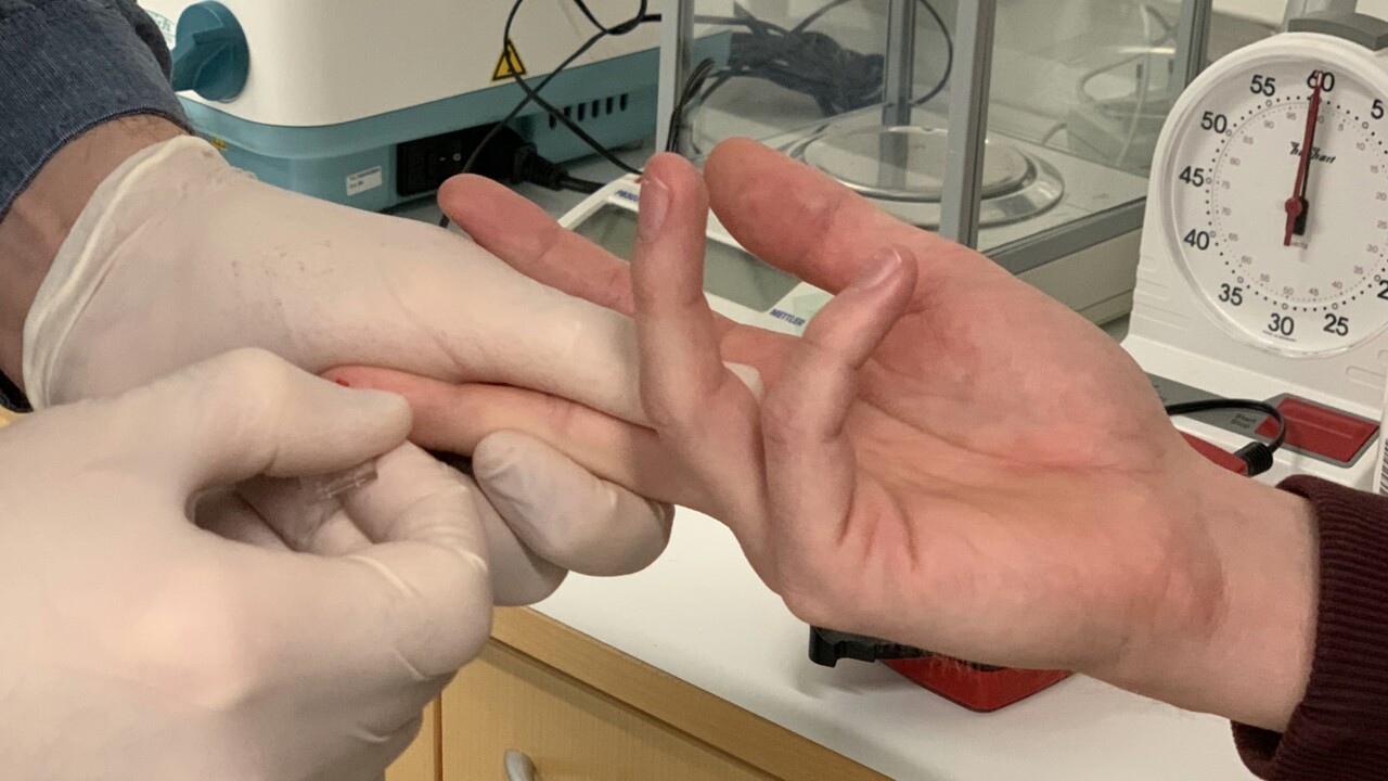 Isabelle Sigfridsson, doktorand, lägger på antikropp på glaset med vävnadssnitt som ska färgas in med immunofluorescens.