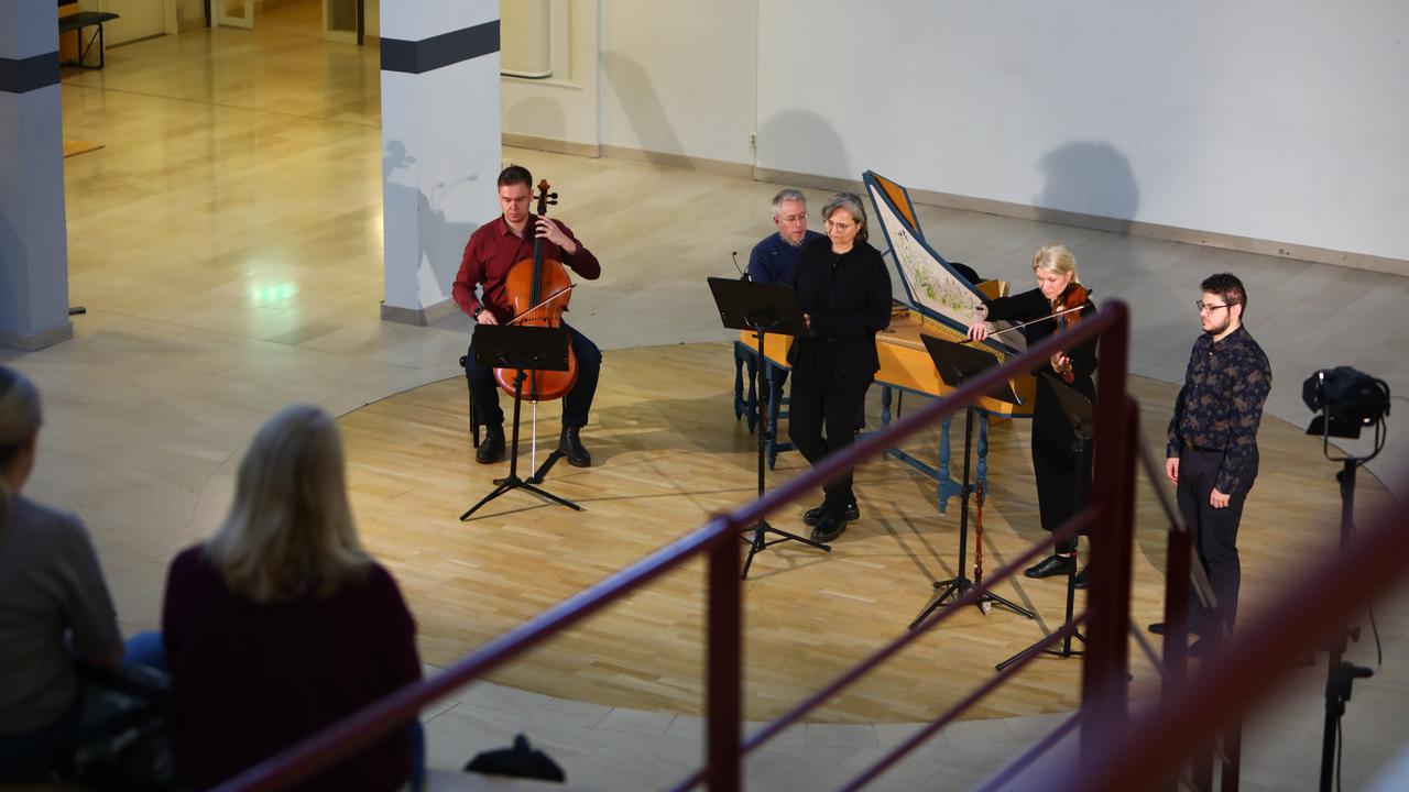 Umeå Barockensamble bjöd på konsert i Ljusgården i Lärarutbildningshuset, som en del i att uppmärksamma 250 år av judiskt liv i Sverige. Jonas Nyström på cembalo, Iris Ridder på sång, Janina Priebe, violin och Christopher Pantelidis-Hermon, barockoboe.