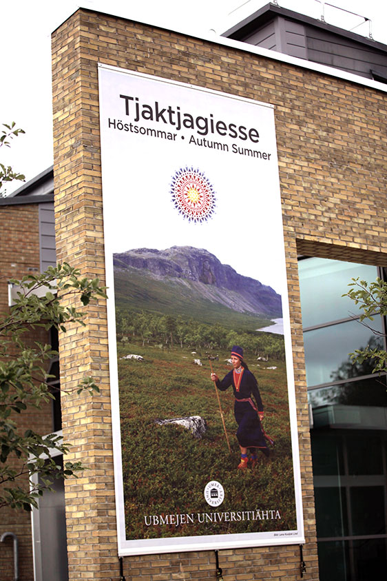 Den nya vepan på Humanisthusets fasad visar hur tjaktjagiesse – höstsommaren – är här. Illustrerat med ett foto av konstnären Lena Kuoljok Lind. Umeå universitets vepaprojekt vill bidra till att öka kunskapen och kännedomen om samiska språk, samhällen, kultur, konst, historia och politik.