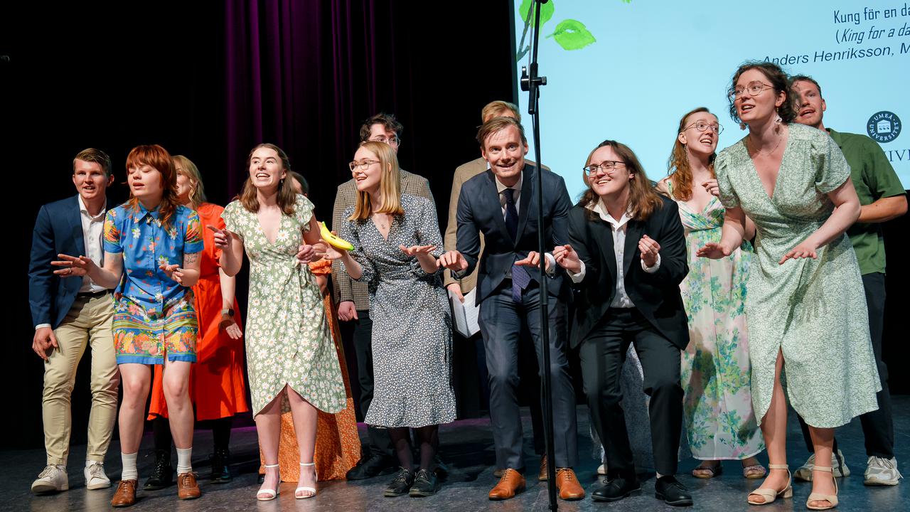 Umeå Studentkör uppträder vid examensceremonin 2025 för internationella mastersprogram.