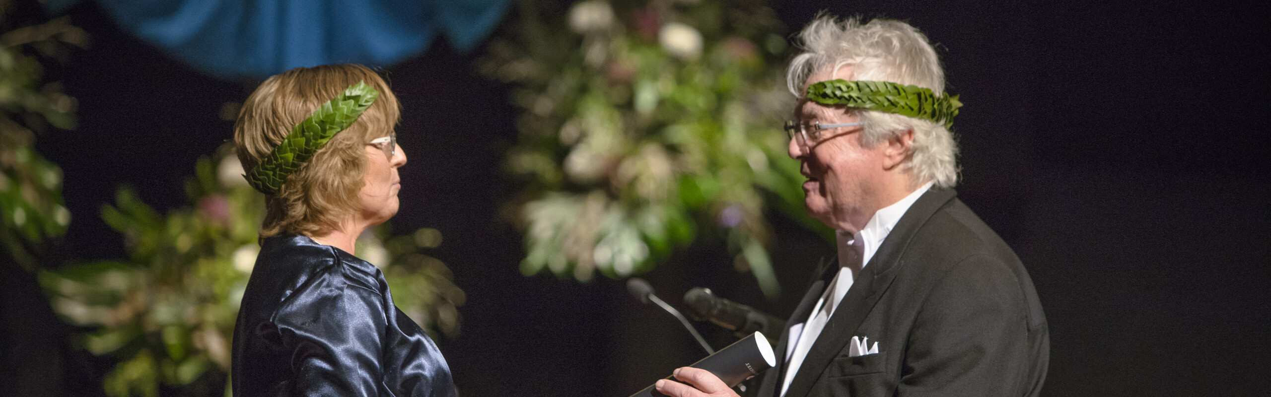 Alla jubeldoktorer vid den Humanistiska, Samhällsvetenskapliga respektive Teknisk-naturvetenskapliga fakulteten vid Umeå universitet som deltar på plats vid ceremonin promoveras med lagerkrans. Lagerkransarna är justerbara och provas ut under övningen.