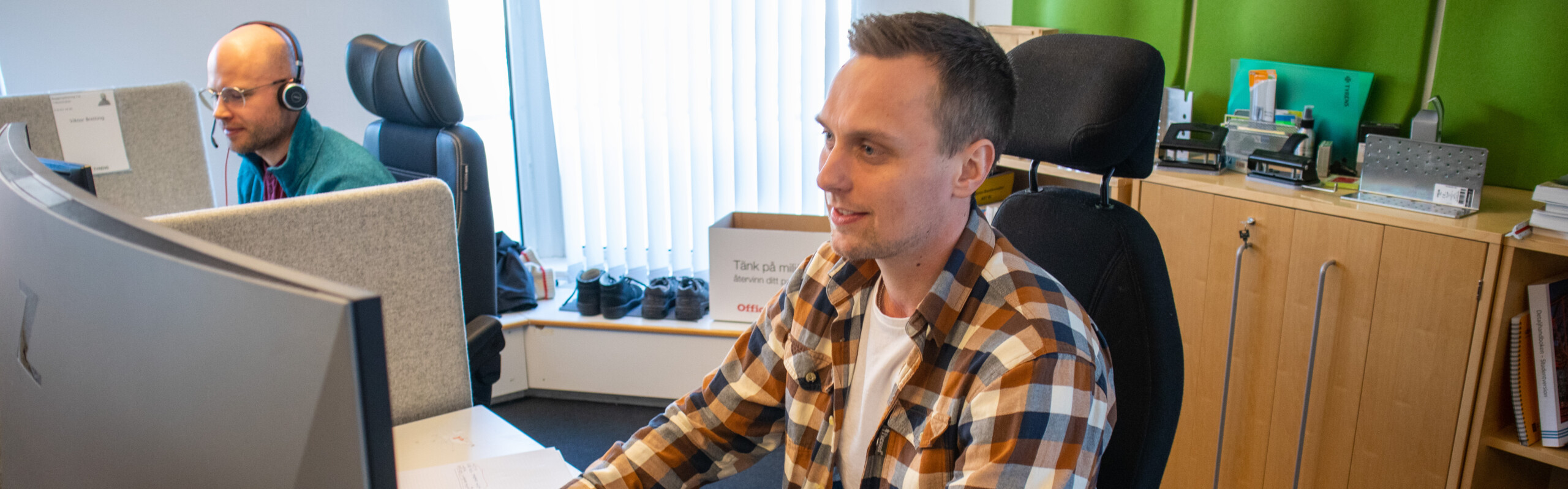 Edvin Fogelberg som pluggar till högskoleingenjör i byggteknik har Co-op-plats på konsultföretaget Tyréns träkonstruktionsavdelning, här i samspråk med konstruktören Daniel Risberg. I bakgrunden hans kollega Viktor Bretting.